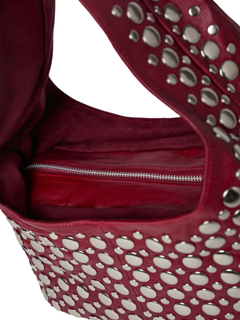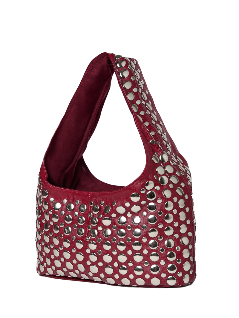 El Bolso de tachuelas Yamba granate  destaca por su elegante diseño y tachuelas plateadas que le aportan un toque moderno y sofisticado. Su talla única es ideal para llevar lo esencial, combinando estilo y funcionalidad. Encuentra este accesorio imprescindible en Ferent Bags y eleva tu look diario con un toque de distinción.