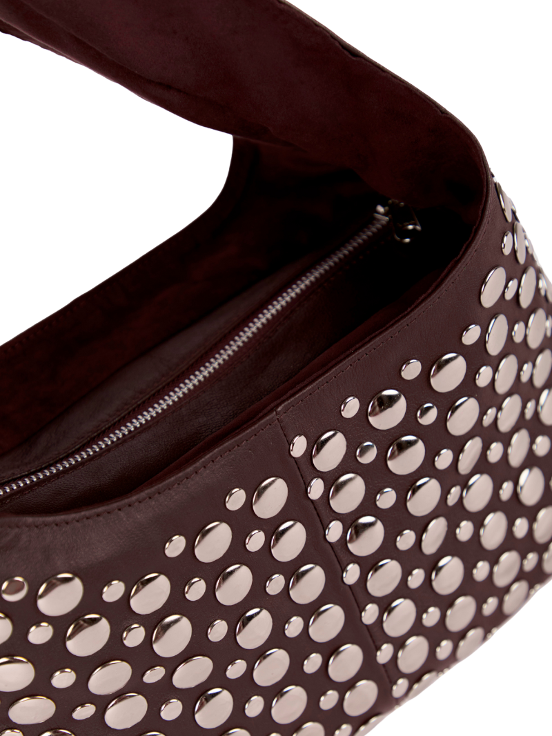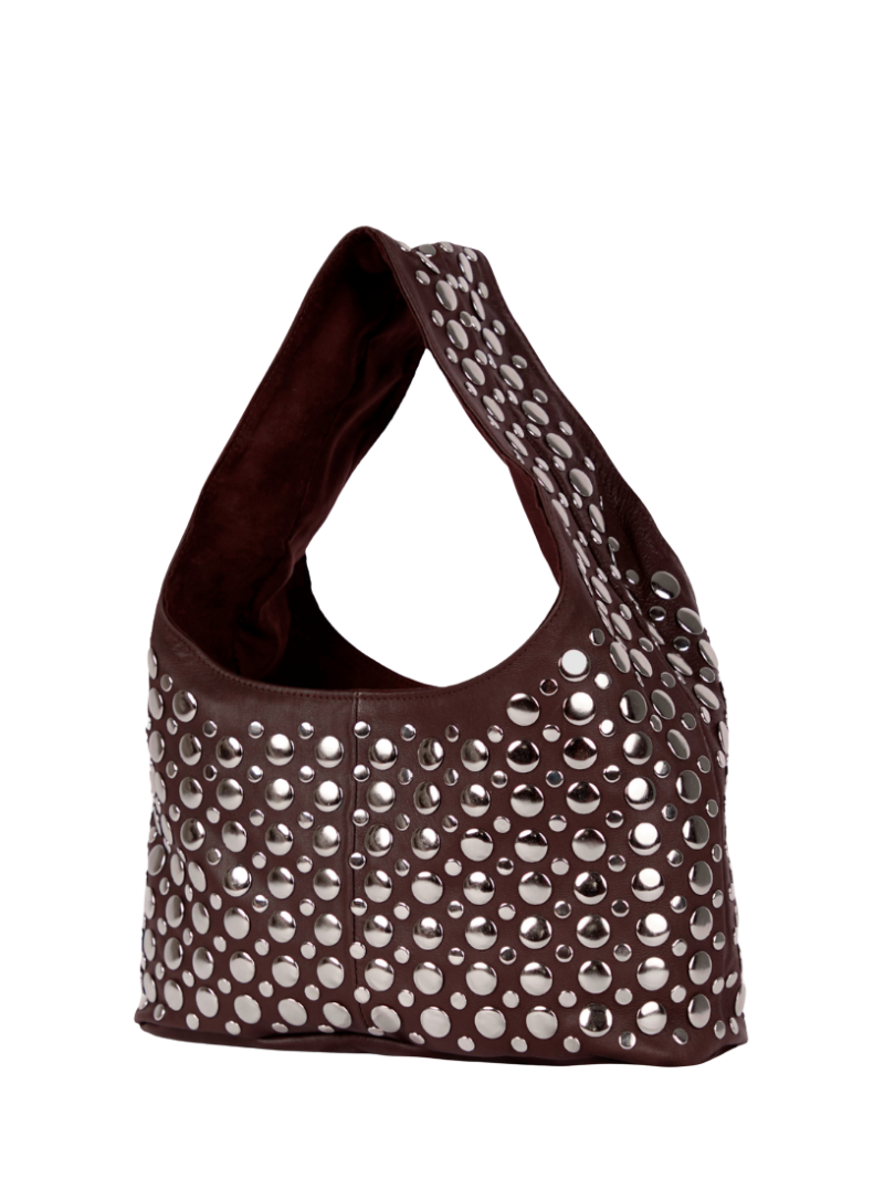 El Bolso de tachuelas Yamba Marrón chocolate destaca por su elegante diseño y tachuelas plateadas que le aportan un toque moderno y sofisticado. Su talla única es ideal para llevar lo esencial, combinando estilo y funcionalidad. Encuentra este accesorio imprescindible en Ferent Bags y eleva tu look diario con un toque de distinción.