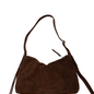 Bolso mediano de ante en color marrón oscuro con una silueta que combina elegancia y atemporalidad. Su correa fina y regulable, permite llevarlo cómodamente cruzado, corto al hombro o en la mano como pouch.