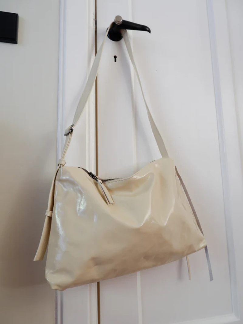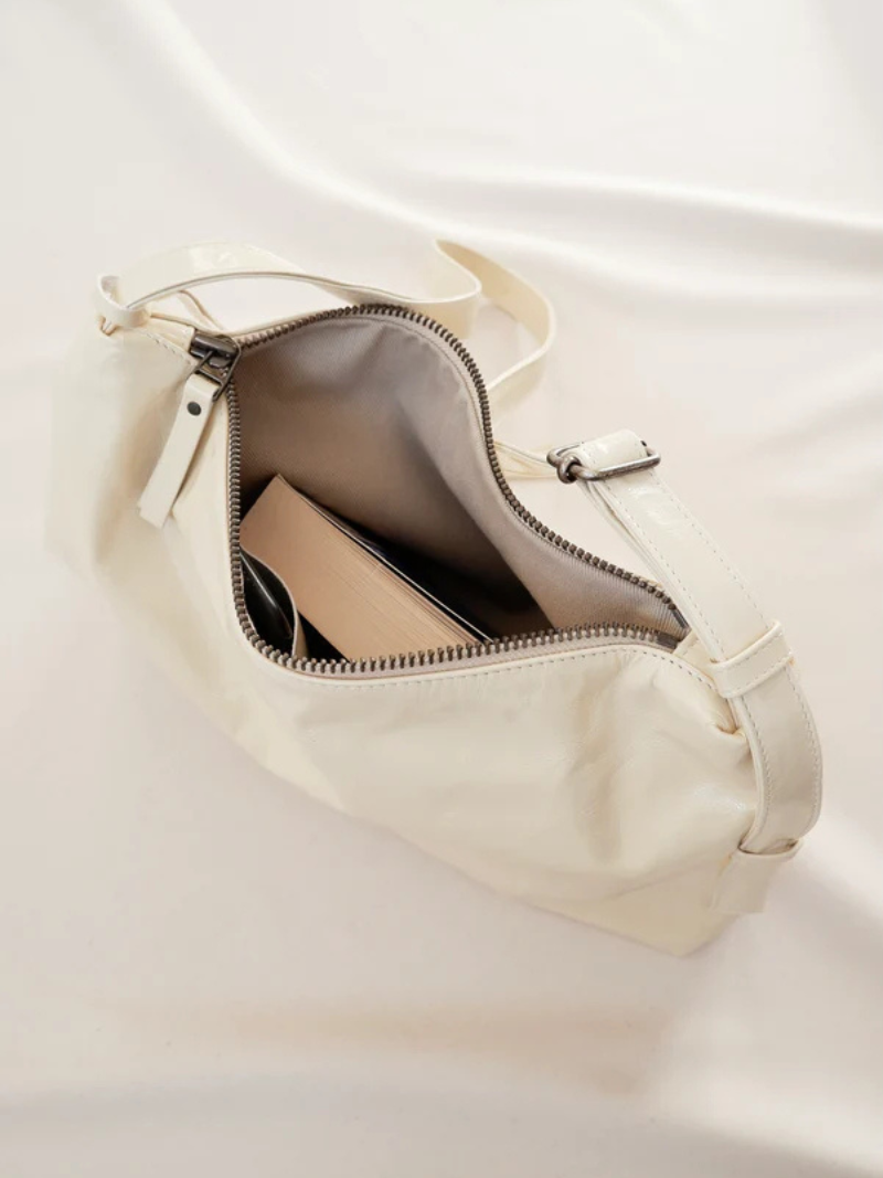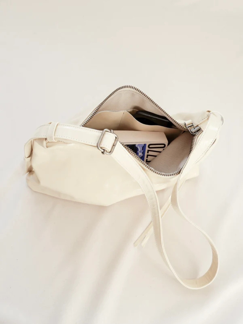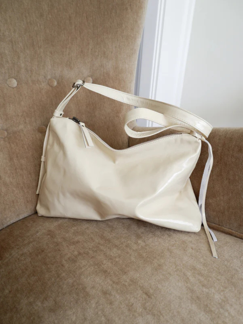 Bolso mediano de piel en color crema con una silueta que combina elegancia y atemporalidad. Su correa fina y regulable, permite llevarlo cómodamente cruzado, corto al hombro o en la mano como pouch.