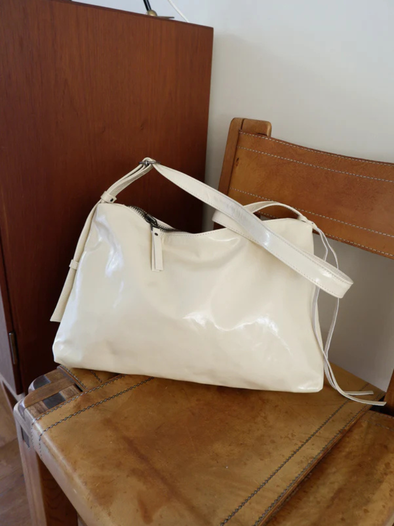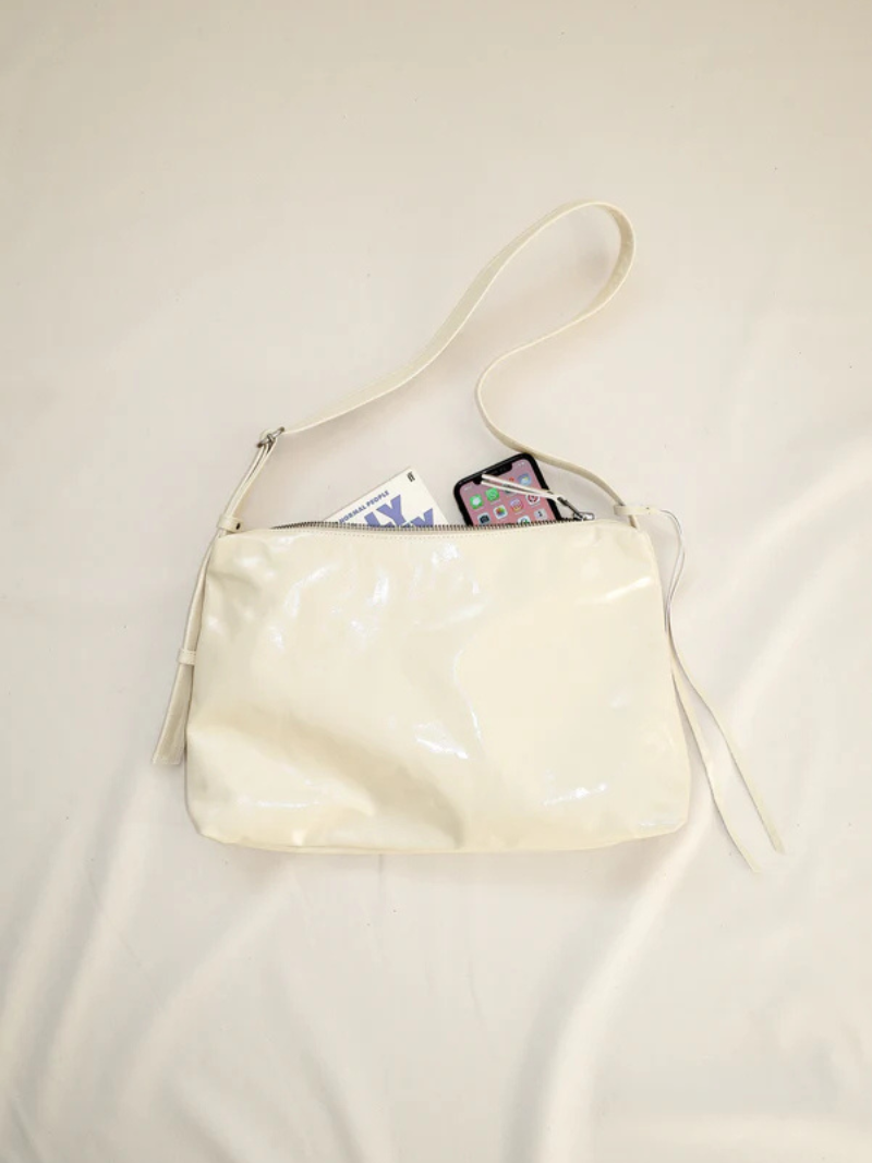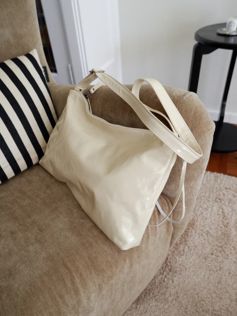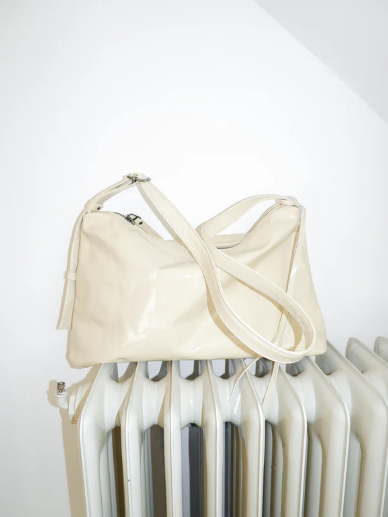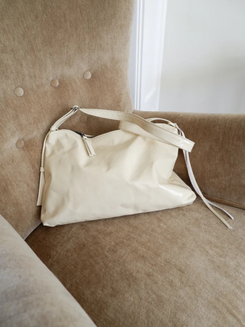 Bolso mediano de piel en color crema con una silueta que combina elegancia y atemporalidad. Su correa fina y regulable, permite llevarlo cómodamente cruzado, corto al hombro o en la mano como pouch.