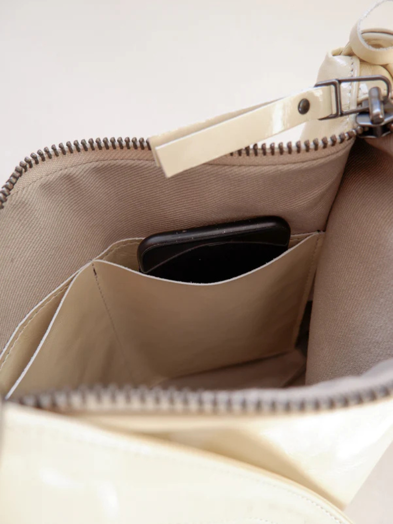 Diseñado para acompañarte en cualquier ocasión, ofrece el espacio perfecto para tus esenciales del día a día y un poco más. Su interior, forrado en 100% algodón beige natural, incluye un práctico compartimento para teléfono y llaves.